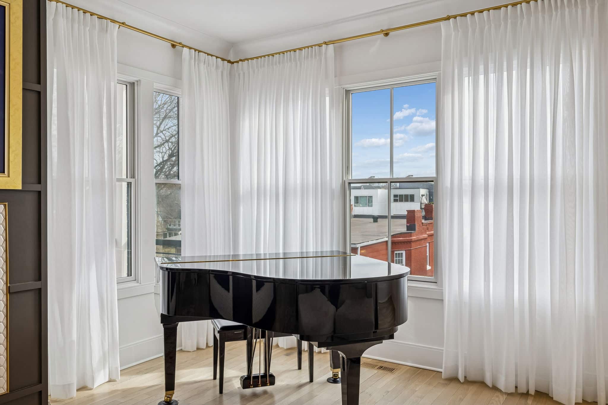 In this Nashville, TN family room, custom sheer drapery softens the space while letting natural light filter in. The panels frame the windows without blocking the view, creating an airy, relaxed backdrop throughout the day.