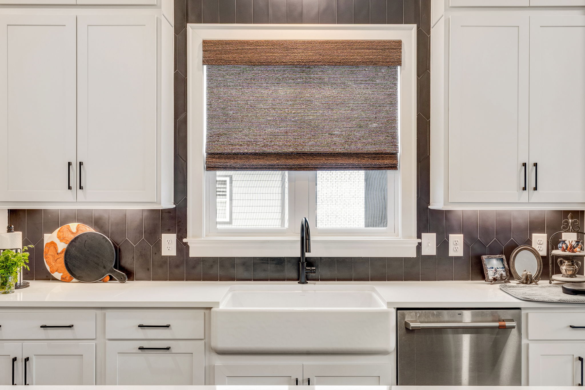 White Custom Roller Shade gently diffuses light into this modern kitchen with charcoal trim
