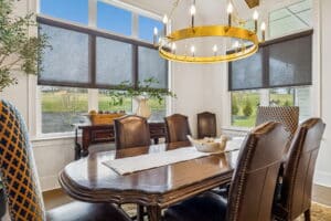 Gray Roller Shades lifted to expose windows, in an Atlanta, GA dining room