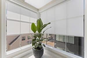 Light filtering Roller Shades in a brightly-lit room white trim and potted plants in Atlanta, GA