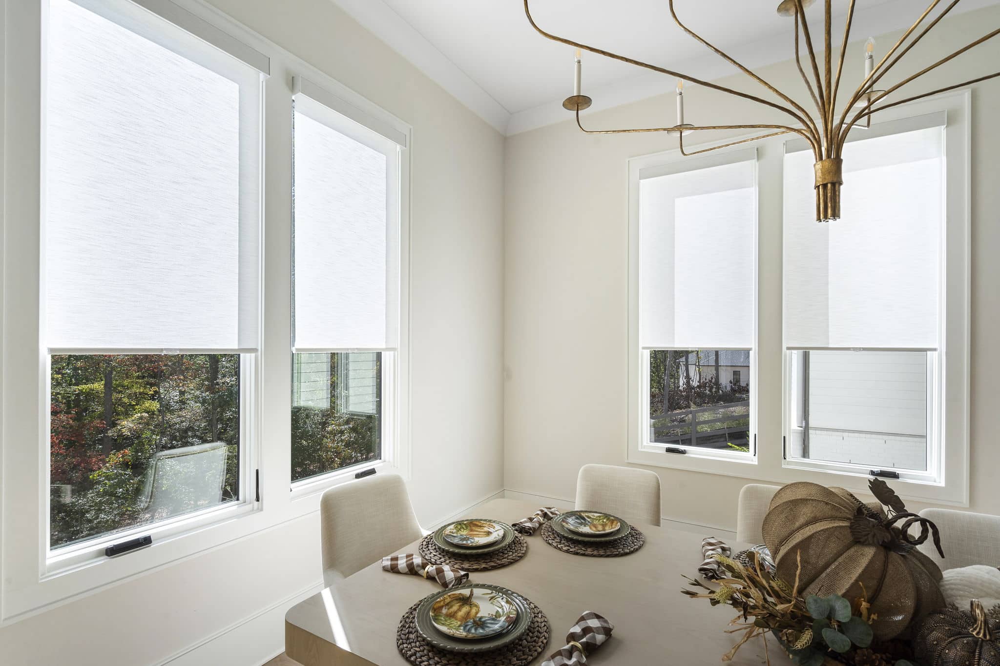 White Roman Shades lifted to expose windows in a modern Nashville, TN dining room