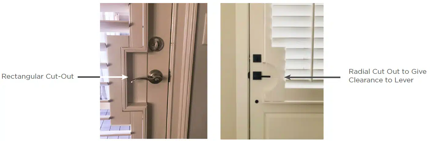 If you prefer to keep your lever handle on your door, a cut-out can be ordered as a specialty option for your shutters. A cut-out is when a portion of the plantation shutter frame is cut out, to make room for your lever.
