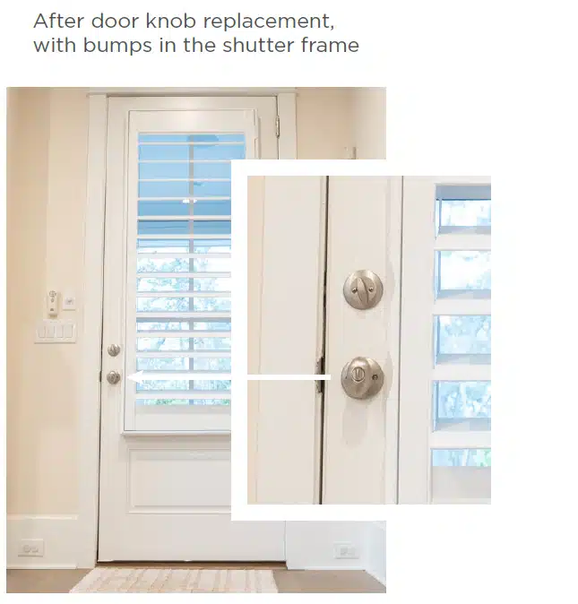 Acadia Shutters does not charge extra for bumps Standard plantation shutters occasionally leave insufficient clearance for lever handles. One solution here is to replace your lever with a knob. This is the cheapest option—it can usually be done for under $100. Installing a door knob is a simple process anyone can accomplish in approximately 30 minutes with only a screwdriver.